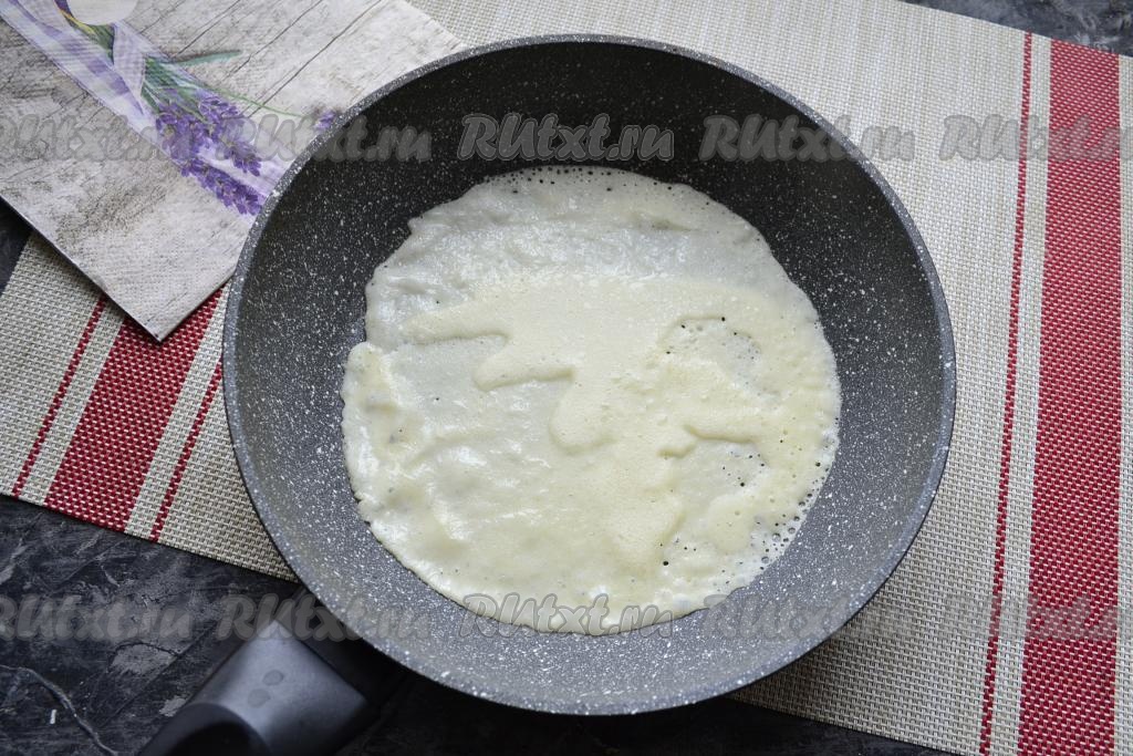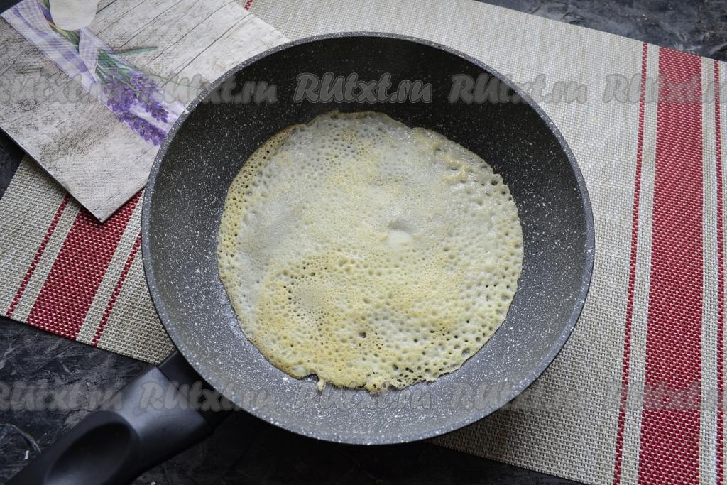Жарить на среднем огне минуты по 2-3 с каждой стороны. Слишком зажаривать не стоит, так как блинчик подсохнет и будет ломаться. Готовый блин переложить на тарелку, а из оставшегося теста пожарить аналогично все блинчики.