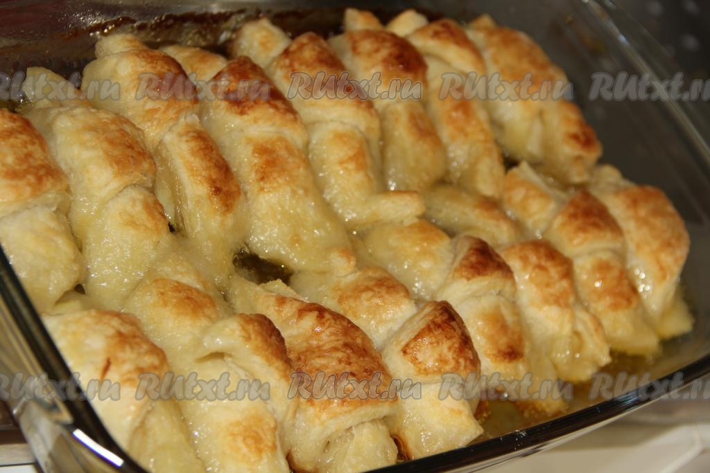 Выложить рогалики из слоёного теста с яблоками в жаропрочную форму, залить смесью масла и сахара.