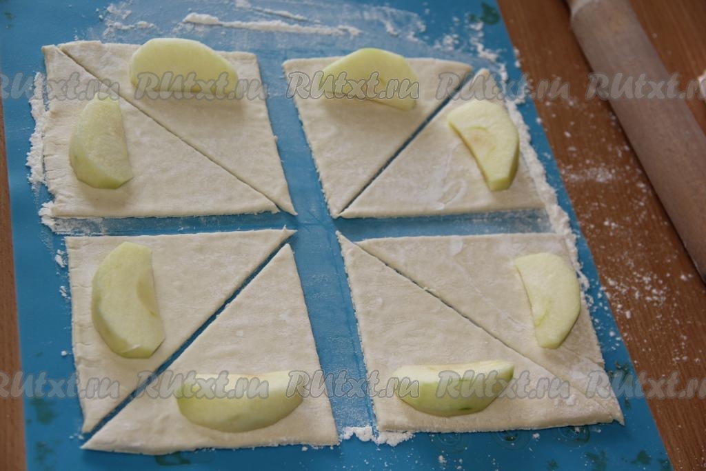 Выложить по дольке яблока на край каждого треугольника. Начиная со стороны, на которую выложено яблоко, свернуть тесто рулетиком. Получится 16 рогаликов с яблоком внутри.