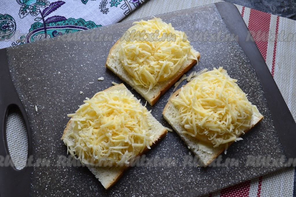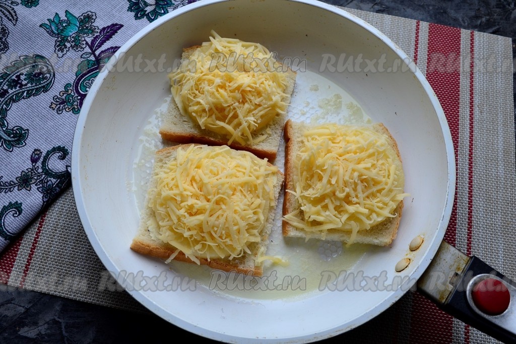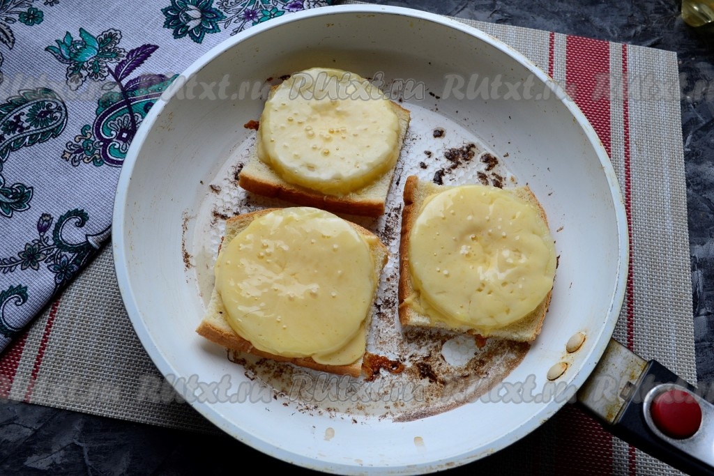 Разогреть сковороду со сливочным маслом и разместить в ней бутерброды начинкой вверх.
