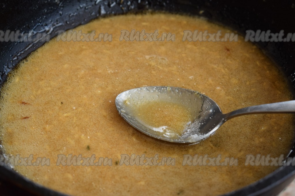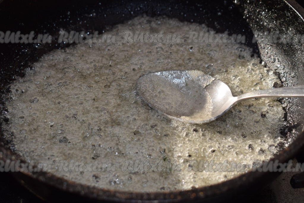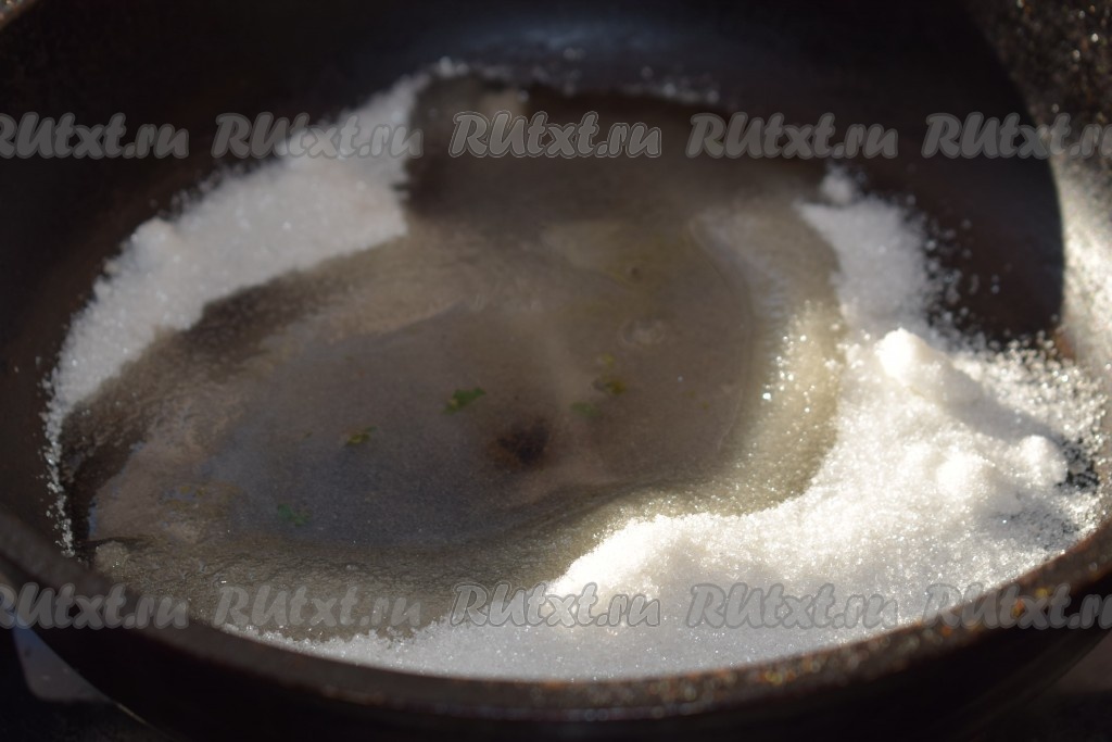 На медленном огне растапливаем сахар с настоем, превращая в карамель. Карамель периодически помешиваем ложкой. Томим карамель на медленном огне, примерно, 4 минуты.