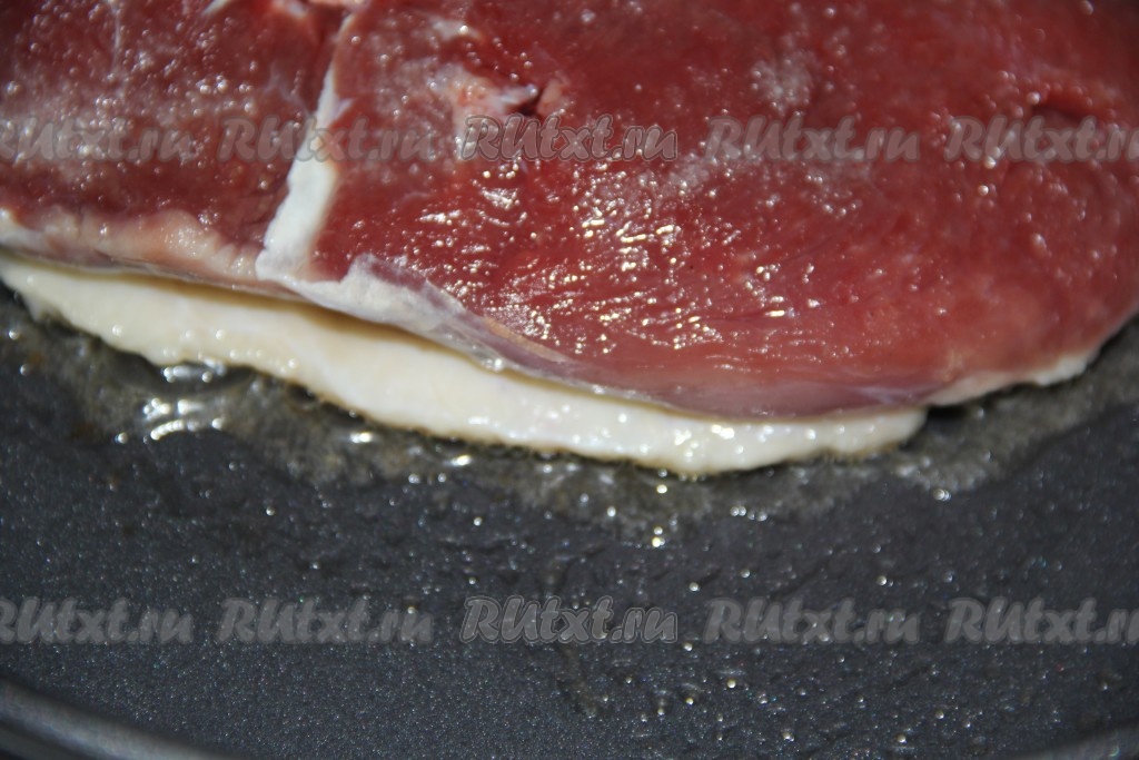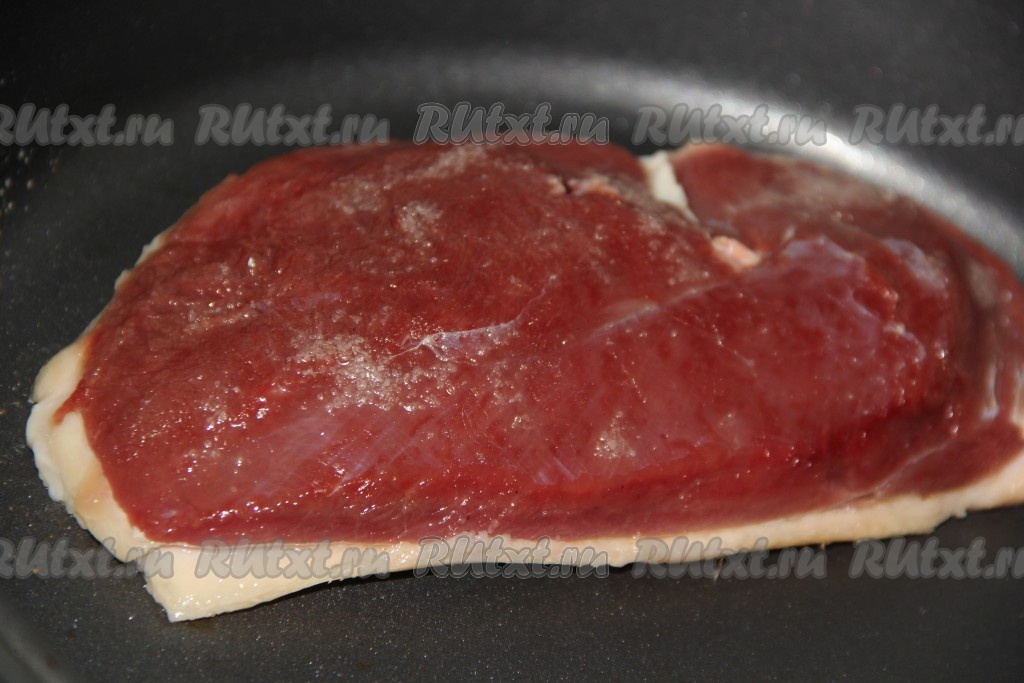 Сковороду хорошо разогреть, масло для жарки не используем, его достаточно в самой утке. Выложить филе утки на горячую сковороду кожей вниз.