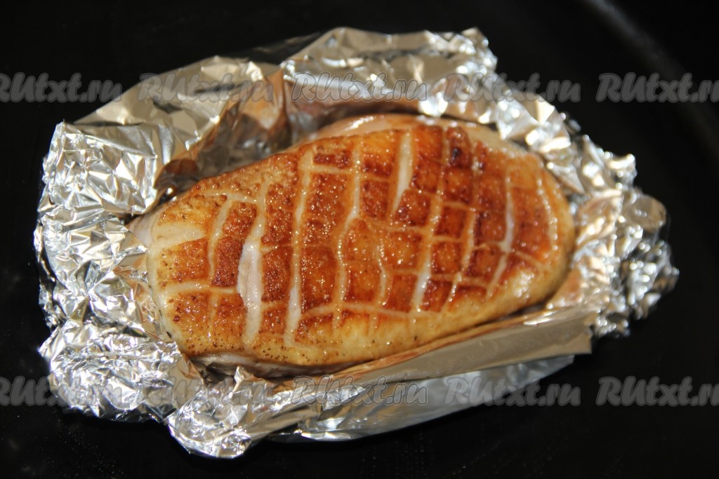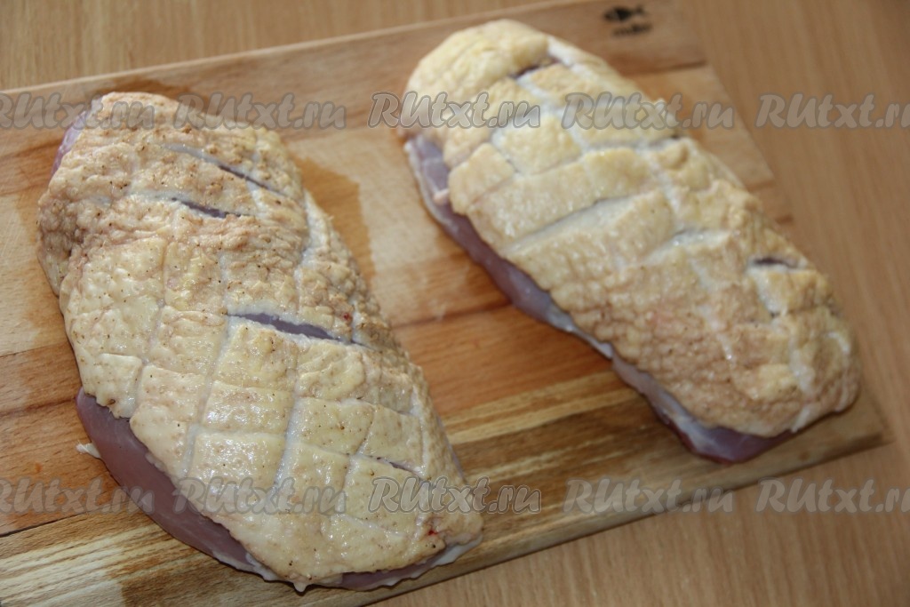 С филе утиной грудки срезать плёночку, кожу не срезаем.