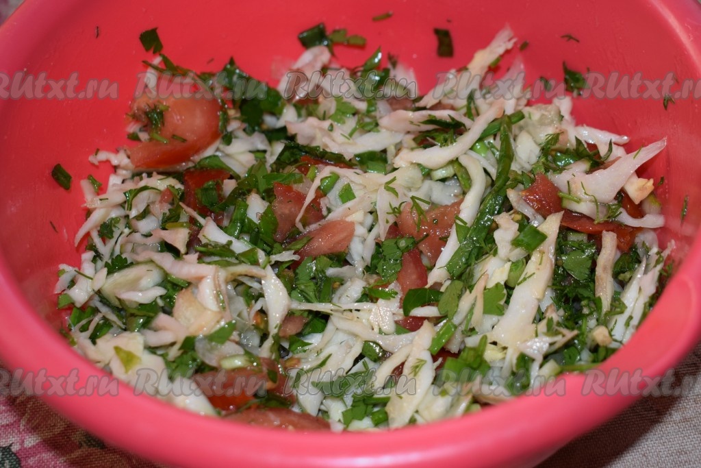К капусте кладём нарезанные зелень, зелёный лук, огурец и помидор, солим, добавляем уксус, 1 столовую ложку растительного масла, щепотку сахара, тщательно перемешиваем.
