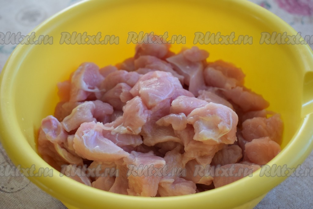Нарежем филе индейки на маленькие кусочки и сложим в миску.