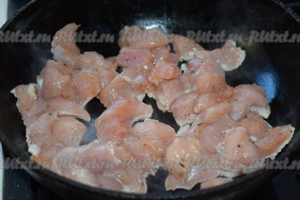Разогреваем сковороду. Выкладываем филе индейки на сухую сковороду без масла (масло у нас есть в маринаде) и обжариваем на среднем огне, примерно, 10 минут (до готовности), постоянно помешивая.