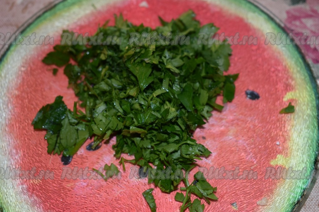 Нарезаем зелёный лук и зелень мелко.