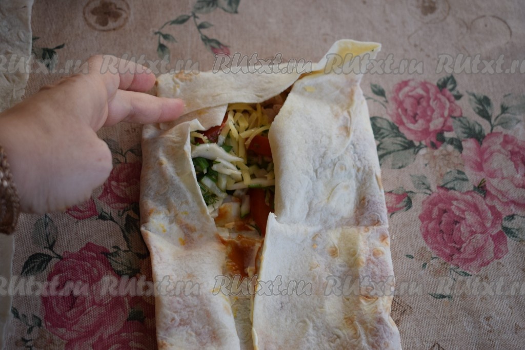 И далее аккуратно начинаем сворачивать нашу домашнюю шаурму. Сначала подгибаем края по бокам, а затем подгибаем верхний край.