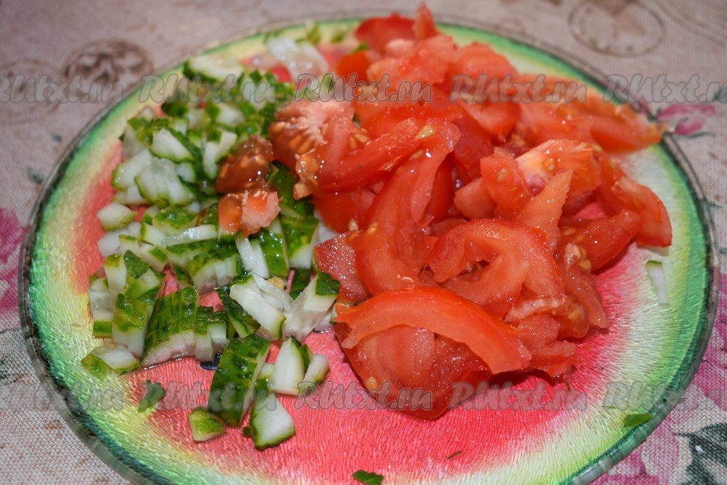 Огурец режем тоненькими полосочками, а помидор - небольшими дольками.