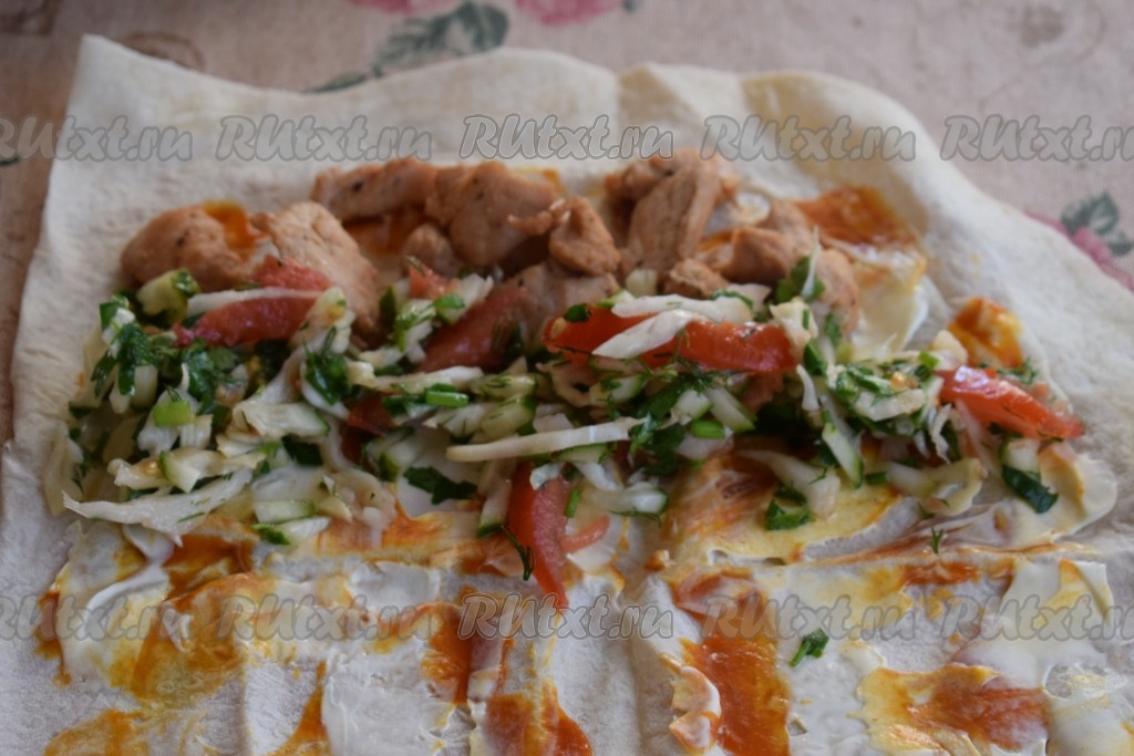 Размазываем кетчуп с майонезом при помощи ложки по поверхности каждой части лаваша, оставляя края лаваша чистыми. На узкий край каждой части лаваша кладём 1/4 часть обжаренного филе индейки, рядом с мясом выкладываем 1/4 часть нарезанных овощей.