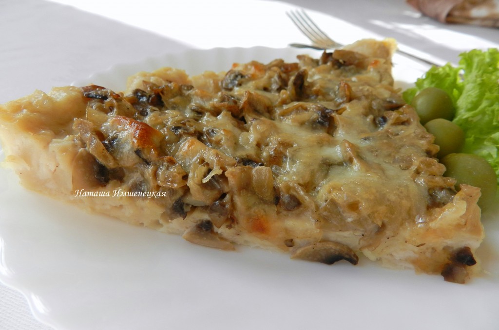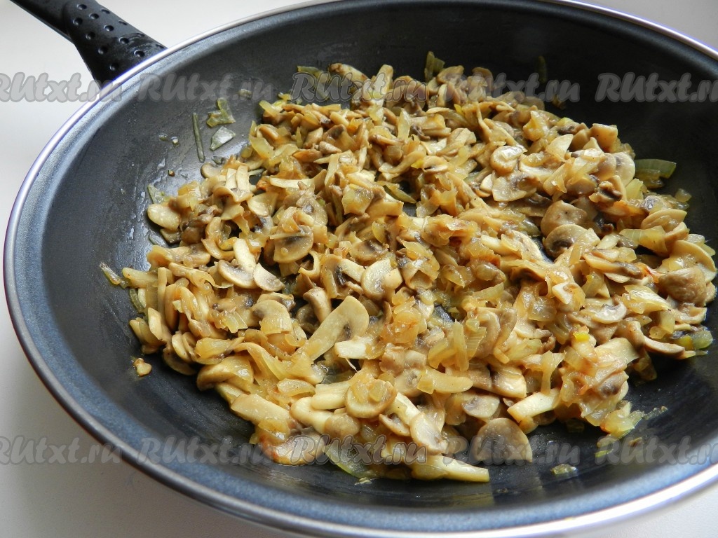 На растительном масле обжарить лук на среднем огне до золотистости (на это потребуется минуты 3), затем выложить шампиньоны. Обжаривать грибы с луком минут 7, помешивая время от времени, затем добавить сливки (или сметану), посолить, поперчить, перемешать, уменьшить огонь и потушить 3-5 минут. Снять с огня и дать грибной начинке полностью остыть.