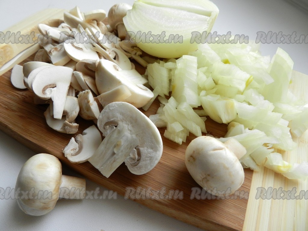 Вначале приготовим начинку, для этого очищенную луковицу и шампиньоны нужно нарезать.