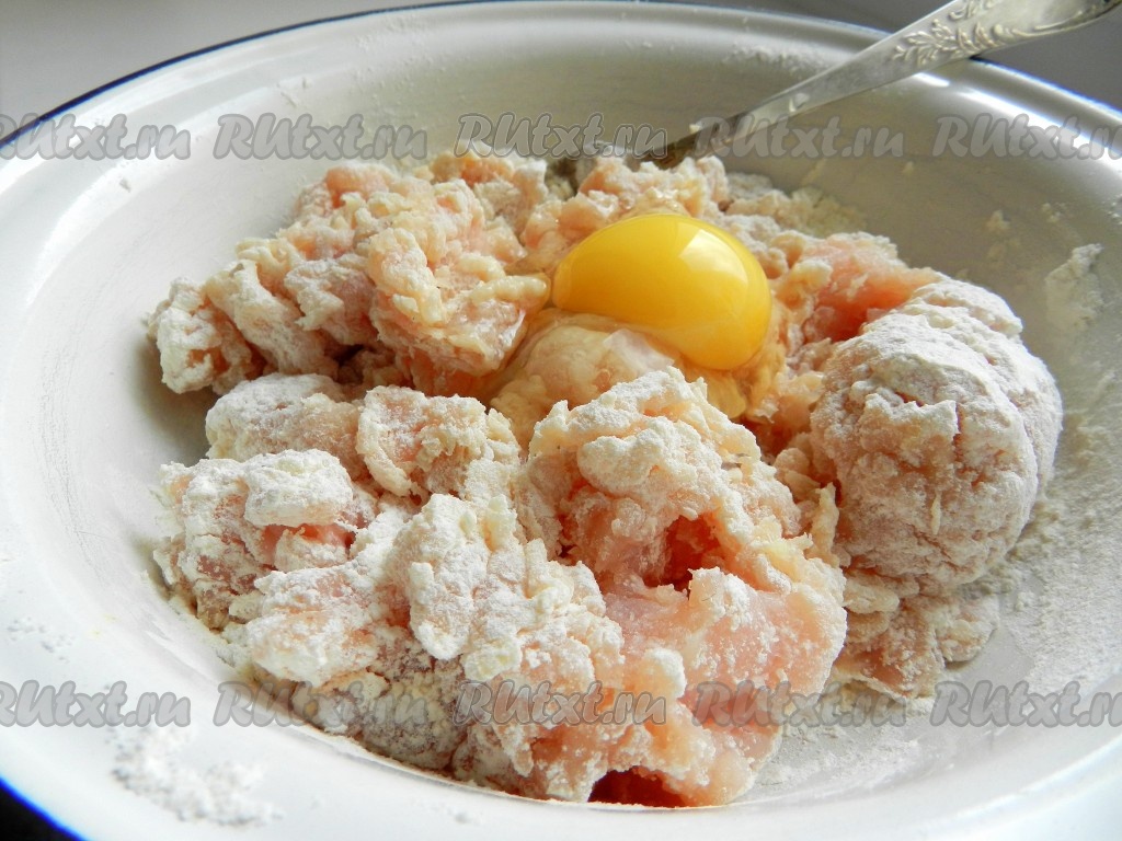 Куриное филе пропустить через мясорубку (или измельчить в блендере), добавить пропущенный через пресс чеснок, яйцо, муку, соль и чёрный молотый перец, тщательно вымесить до однородности.