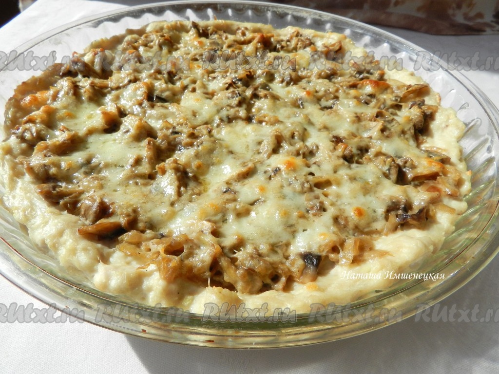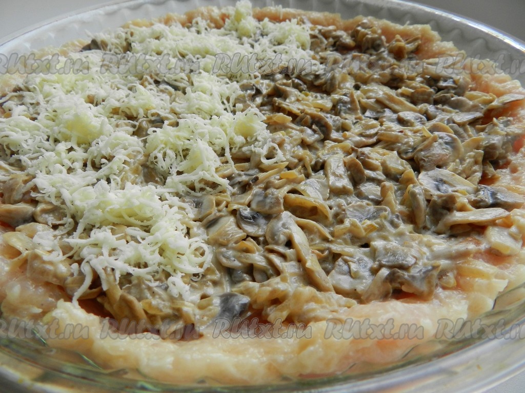 На дно формы для выпечки, смазанной маслом, равномерно выложить куриный фарш, формируя маленькие бортики - это будет корж (основа) нашей пиццы. Поверх фарша выложить остывшие шампиньоны, обжаренные с луком. Грибную начинку сверху посыпать натёртым сыром. Духовку разогреть до 220 градусов, поставить в неё форму с куриной пиццей, выпекать 15-20 минут.