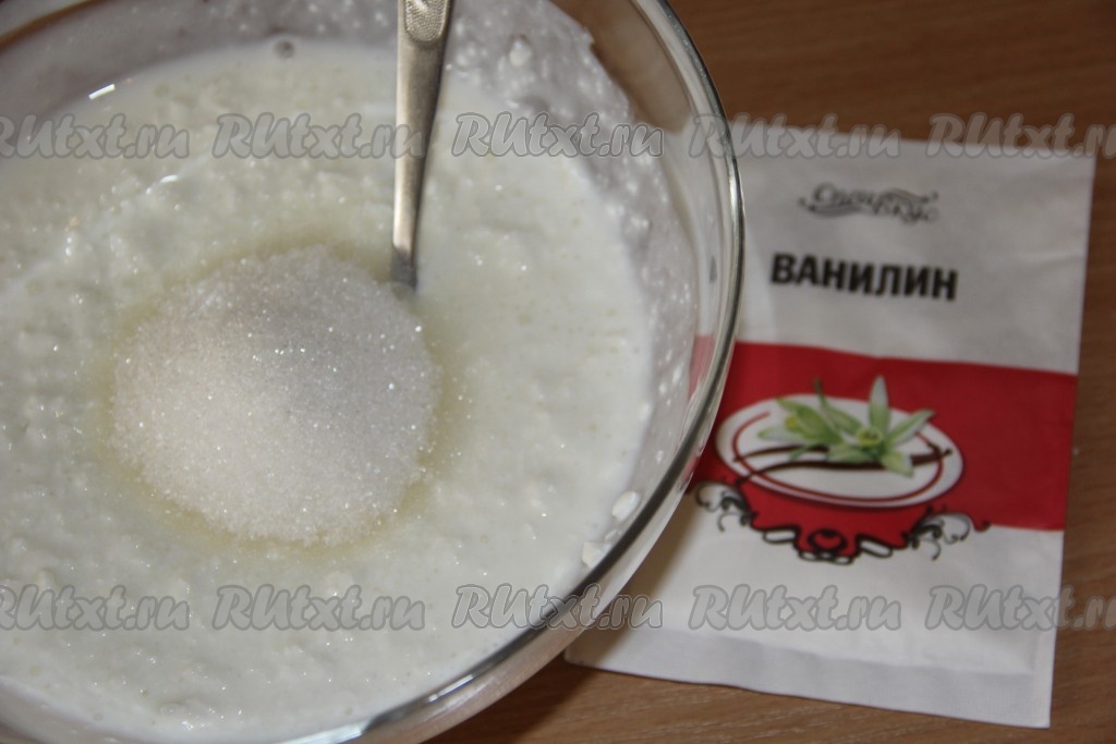 Перемешать смесь кефира и творога столовой ложкой, затем всыпать сахар и ванилин.