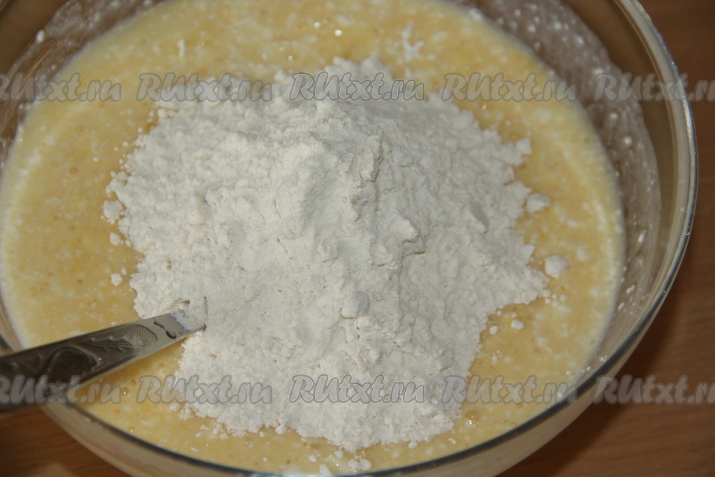 Хорошо перемешать массу ложкой, всыпать муку и соль.