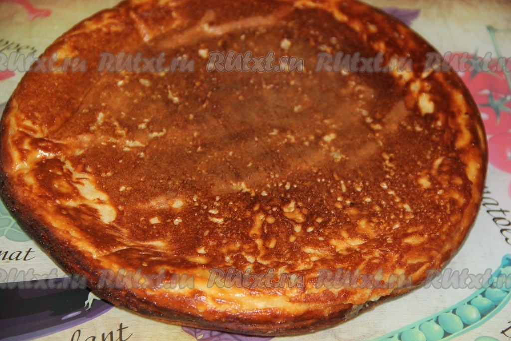 Верх пирога схватится и не будет жидким. Аккуратно перевернуть пирог и выпекать ещё 7 минут под крышкой.