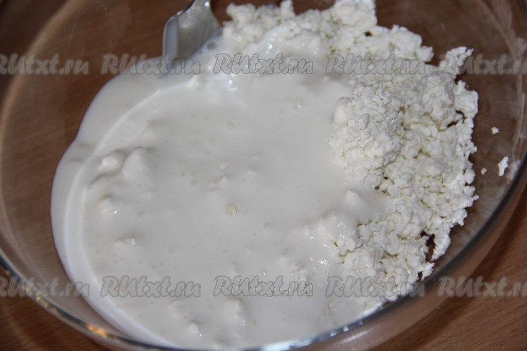 Соединить творог и кефир.