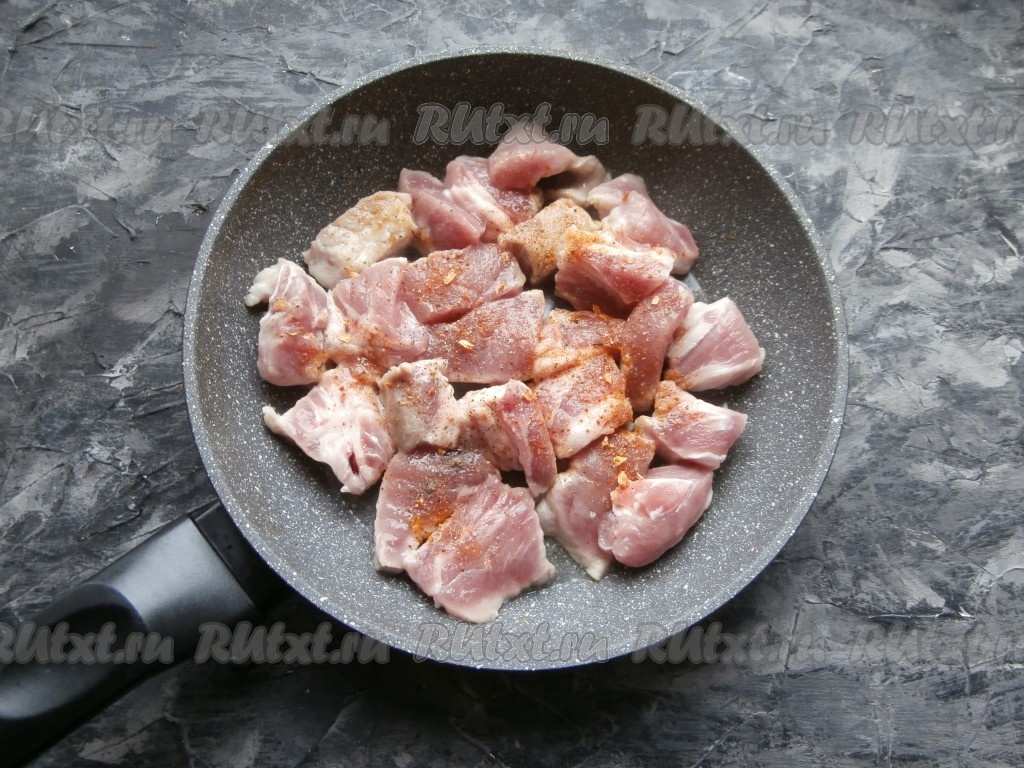 В сковороду, разогретую с растительным маслом, поместить свинину, посыпать специями и солью.
