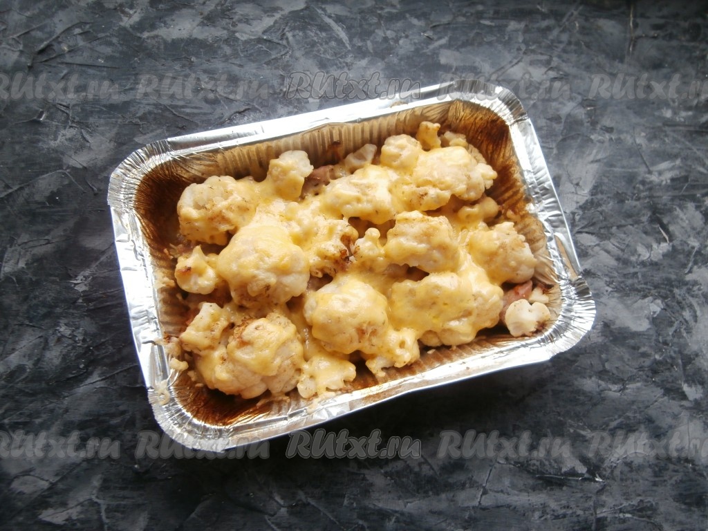 Достать форму из духовки. Вкуснейшую, нежнейшую свинину и приятно похрустывающую цветную капусту подавать к столу в горячем виде. Отличное блюдо, попробуйте!