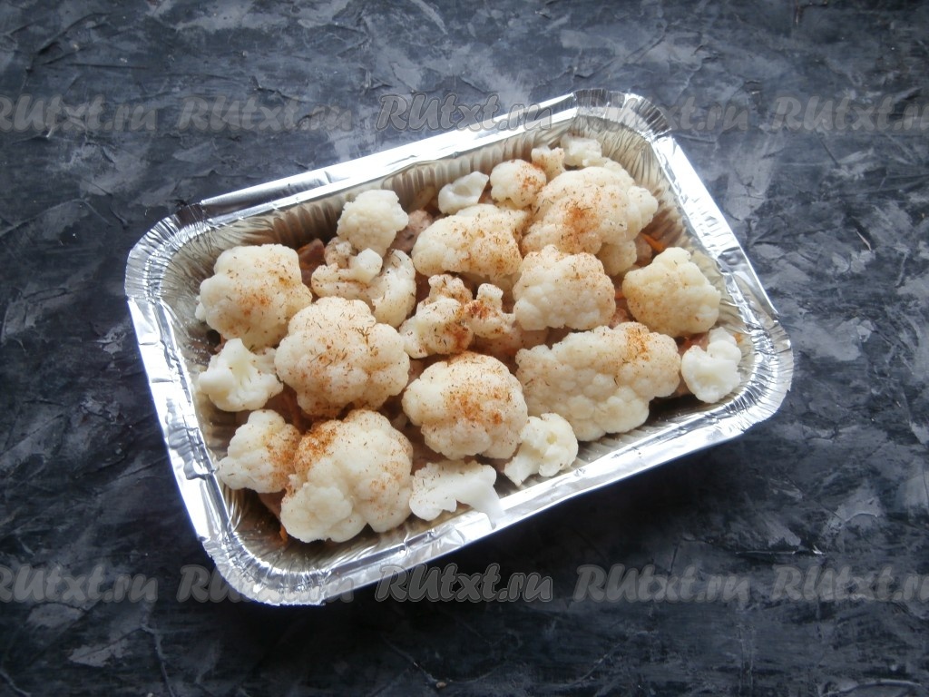 Сверху разместить в один слой соцветия цветной капусты, посыпать немного солью и приправой для овощей.