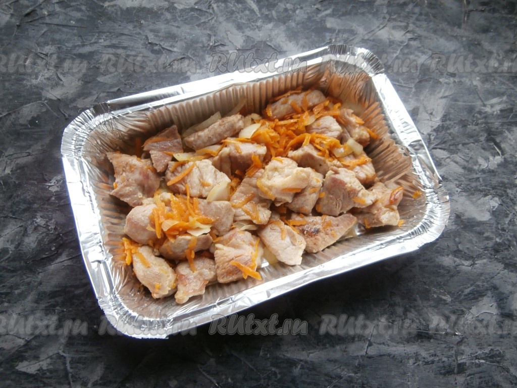 Обжарить свинину с морковкой и луком до мягкости овощей (3-4 минуты), периодически помешивая, после чего выложить в подходящую форму для запекания.