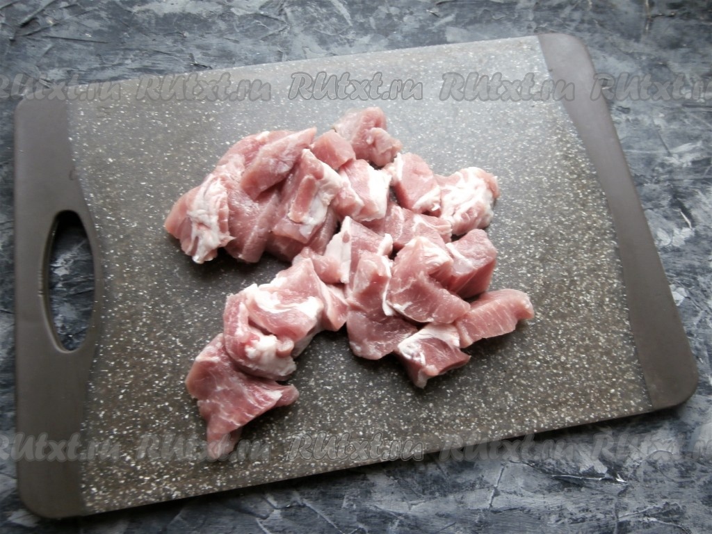 Морковку и лук почистить. Свинину нарезать средними кусочками.