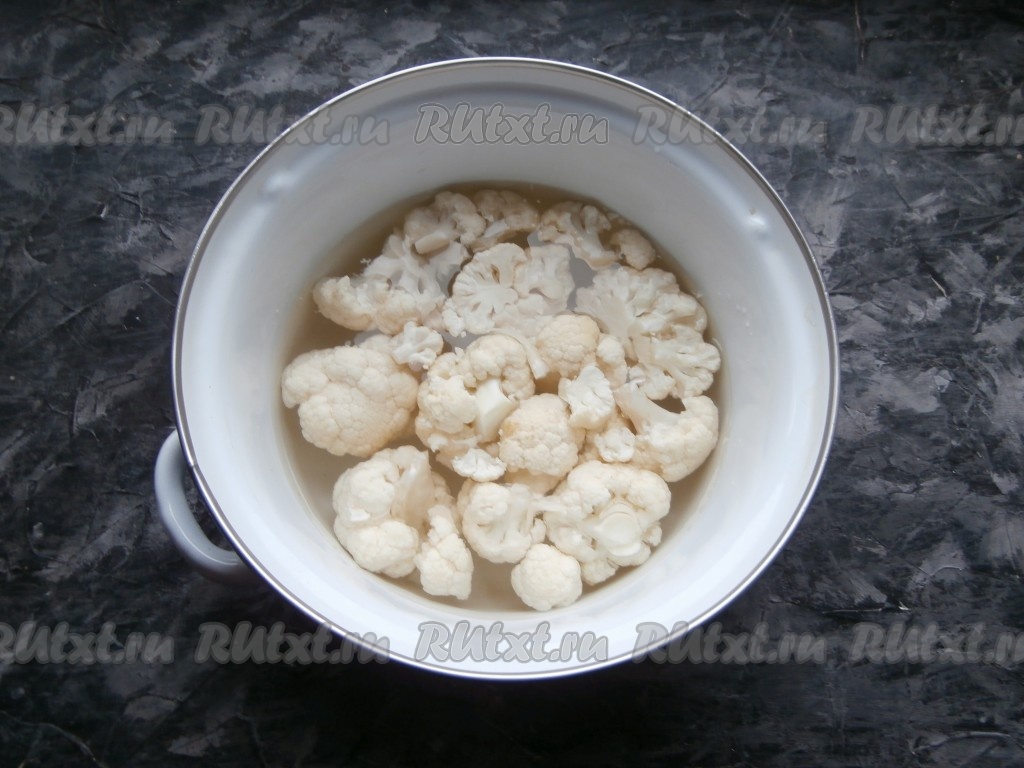 Капусту цветную разобрать на соцветия, выложить в кастрюлю, залить холодной водой, поставить на огонь и дать закипеть. Газ выключить, капусту достать и облить холодной водой.