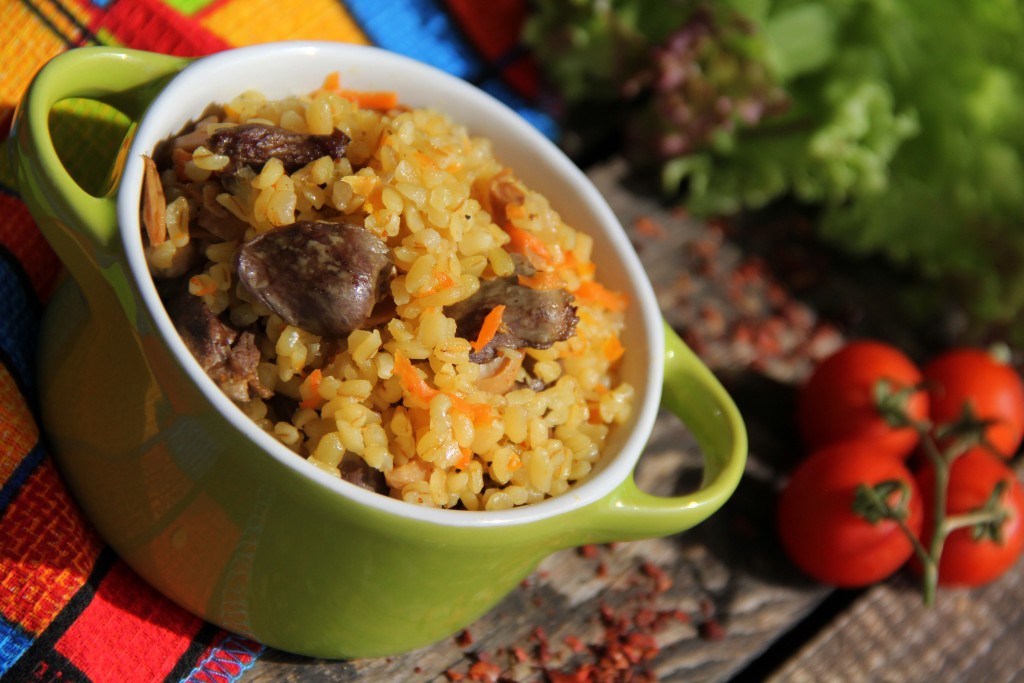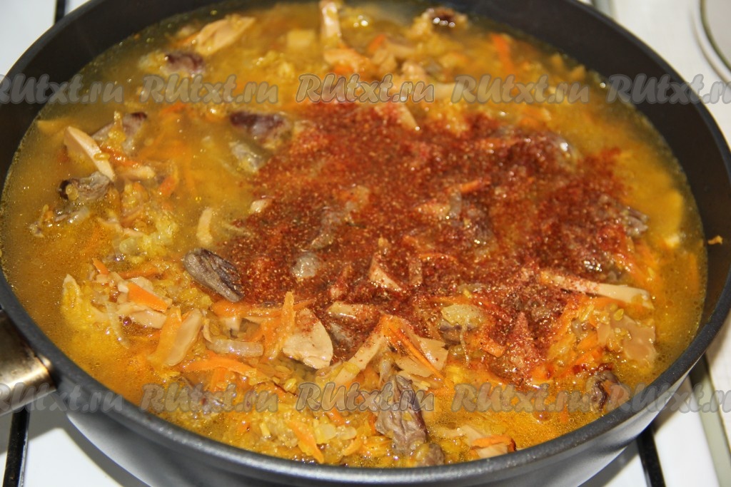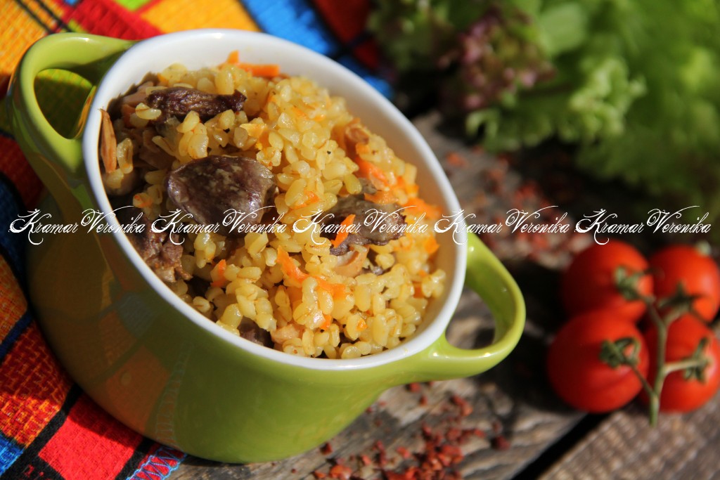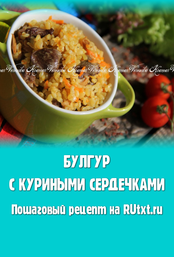Булгур не промывать! Всыпать сухой булгур в сковороду к куриным сердечкам.