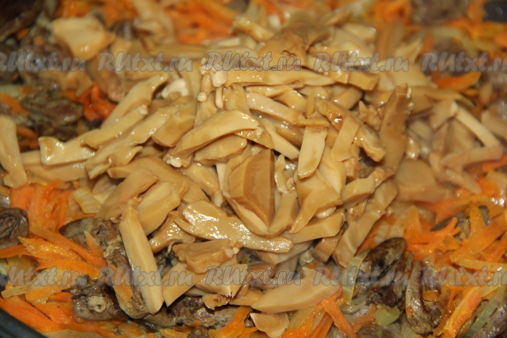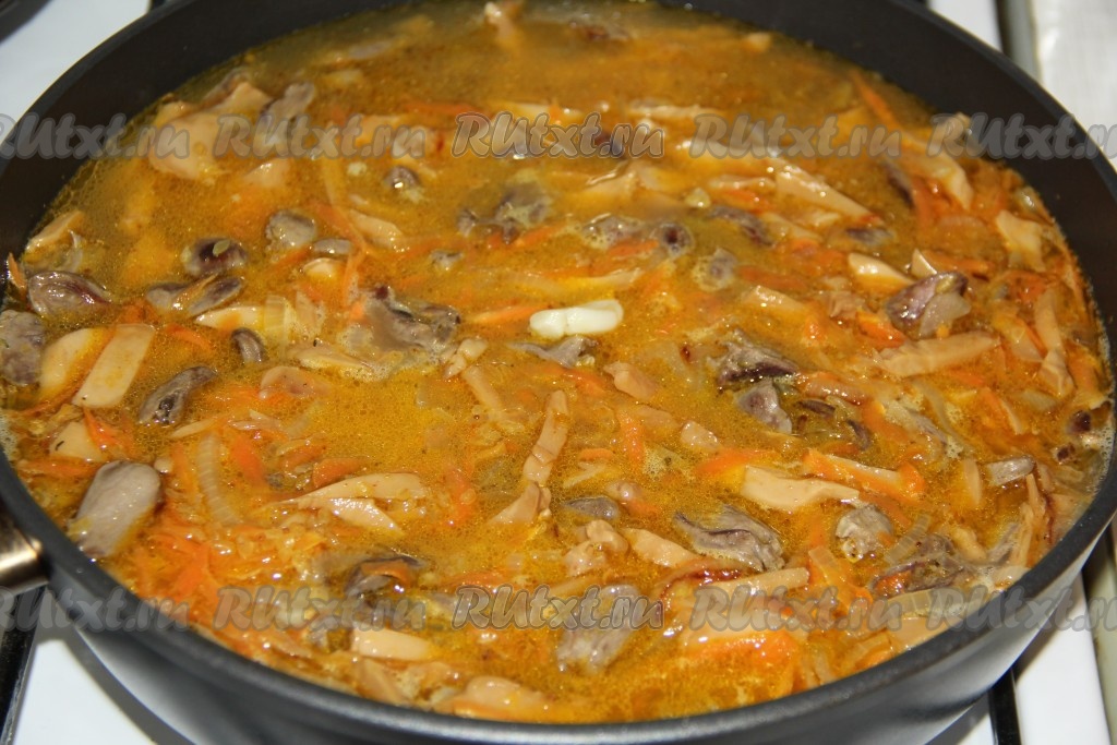 Затем добавить маринованные шампиньоны и потушить 5 минут. Если у вас нет грибов или вы их не любите, то можете грибы не добавлять, а просто протушить куриные сердечки с морковкой и луком ещё в течение 3-5 минут.