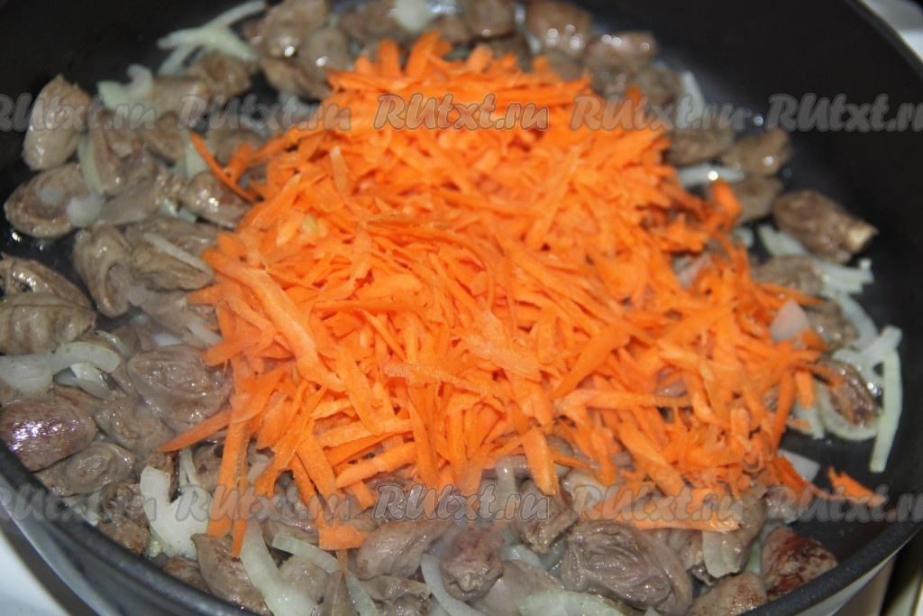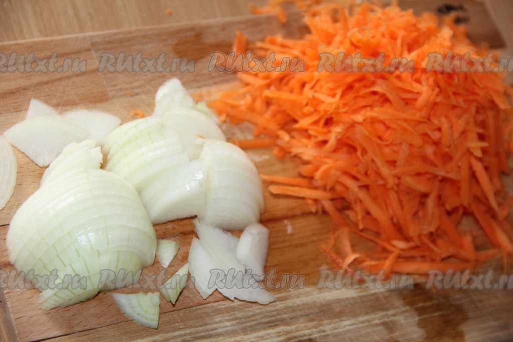 Пока сердечки тушатся, почистить лук и морковь. Лук нарезать на средние кусочки, а морковь натереть на тёрке.
