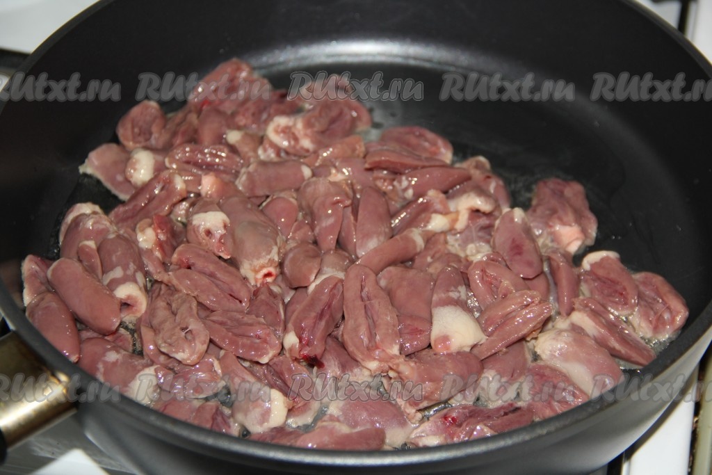 Сначала обжарить сердечки на сильном огне, помешивая, в течение нескольких минут, затем убавить огонь и тушить сердечки под крышкой 20 минут на небольшом огне, периодически перемешивая. Сердечки выделят сок.