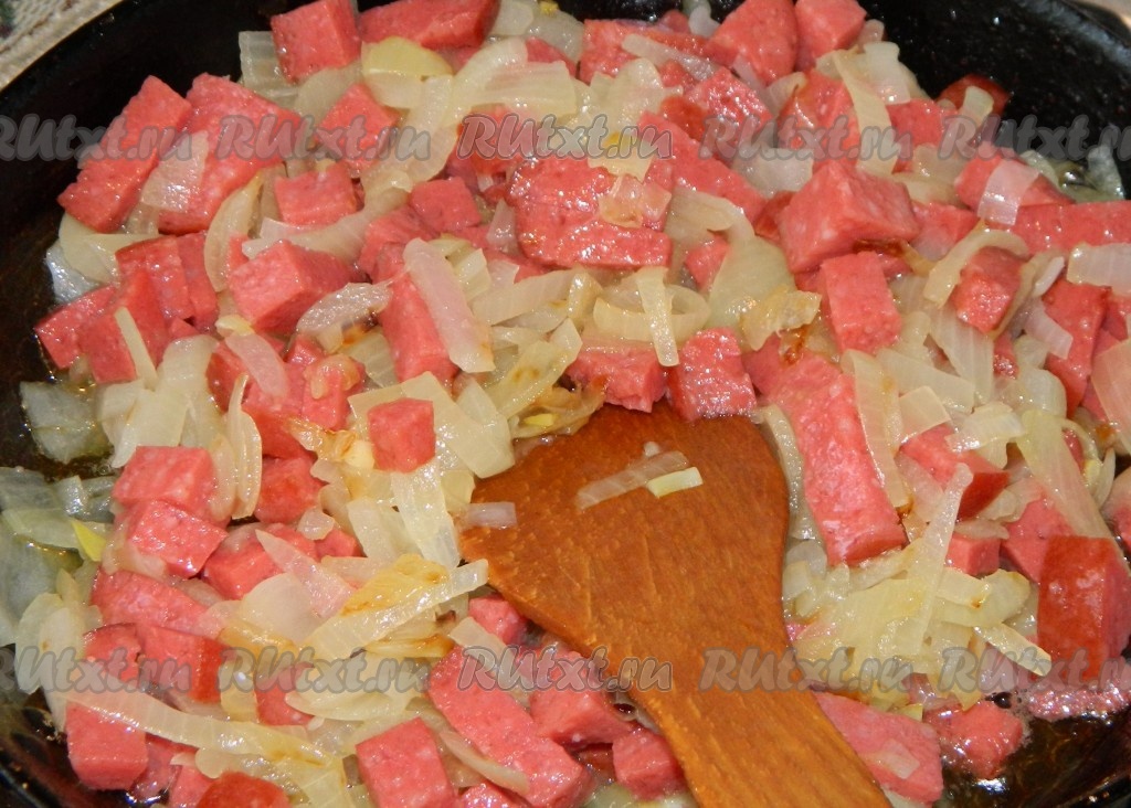 Порезанную колбасу отправляем жариться к луку.