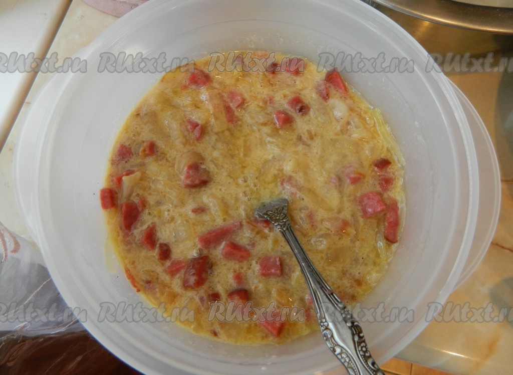 В сметано-яичную массу добавляем жареные лук с колбасой, перемешиваем.