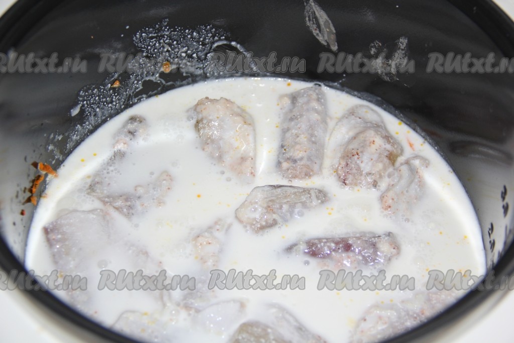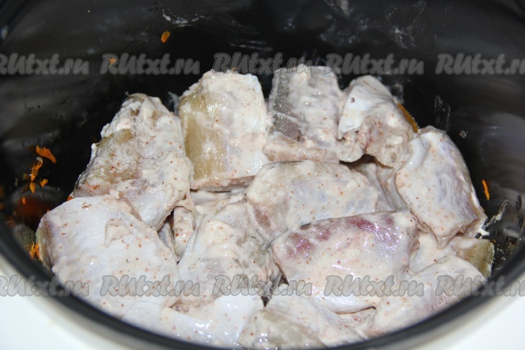 Влить получившийся сметанный соус в мультиварку поверх минтая и моркови, включить режим "Тушение" на 40 минут и закрыть мультиварку крышкой.