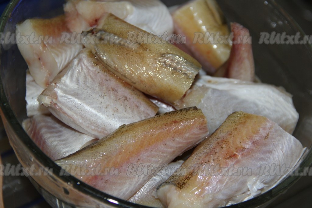 Минтая полностью разморозить при комнатной температуре. Каждую рыбку промыть под водой, удалить голову, плавники, хвост и внутренности (не забудьте удалить и чёрную плёночку из брюшка), нарезать на порционные кусочки.