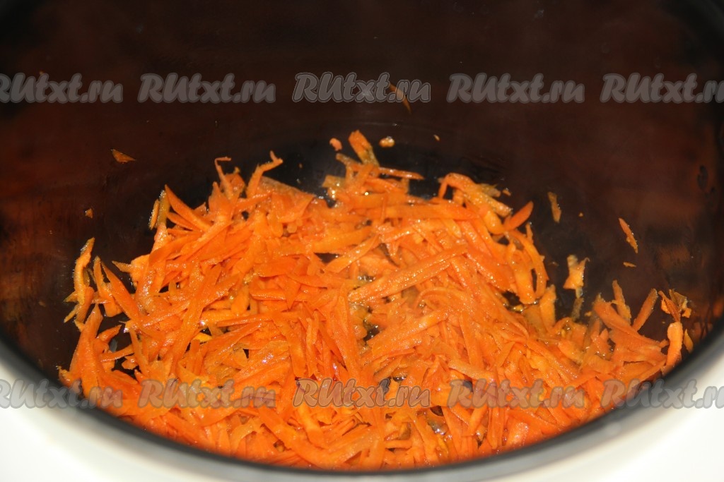 В чашу мультиварки влить немного растительного масла, выложить морковку, предварительной очищенную и натёртую на крупной тёрке, и включить режим "Жарка".