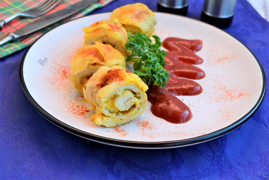 Если сало не любите, его после запекания можно просто убрать, а рулет нарезать на части, выложить на тарелку, сверху украсить паприкой.