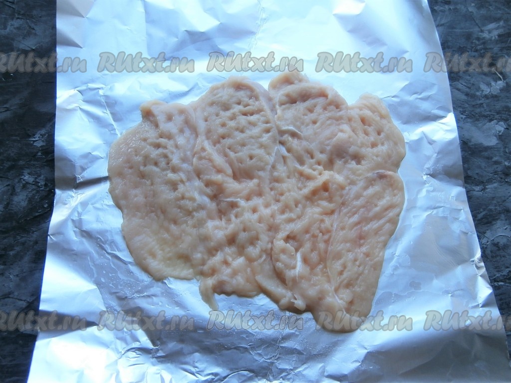 Куриное филе нарезать тонкими пластами, как для отбивных. Отбить мясо молоточком. Отбитые кусочки филе выложить на лист фольги внахлёст - одним тонким слоем.