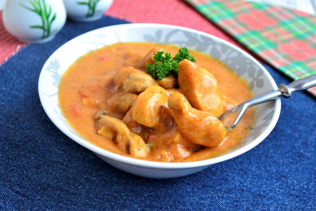 Довести подливку до кипения, прикрыть сковороду крышкой и тушить гуляш из индейки на минимальном огне около 15 минут.