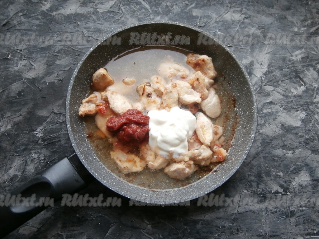 Перемешать, добавить сметану и томатную пасту, влить горячую воду.