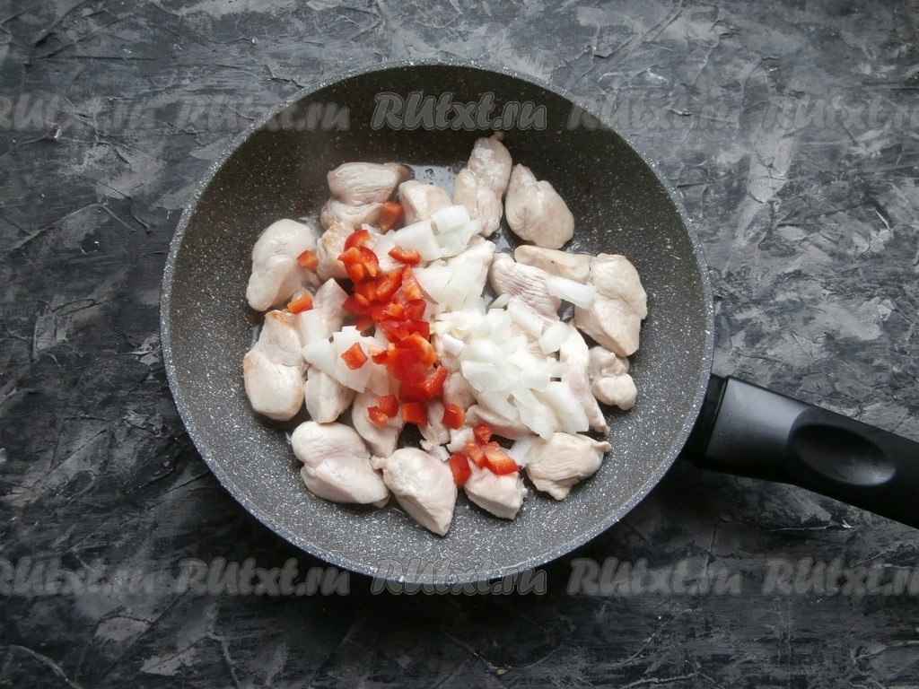 Обжарить кусочки индейки на среднем огне на растительном масле, помешивая, до изменения цвета. Добавить мелко нарезанные лук и болгарский перец.