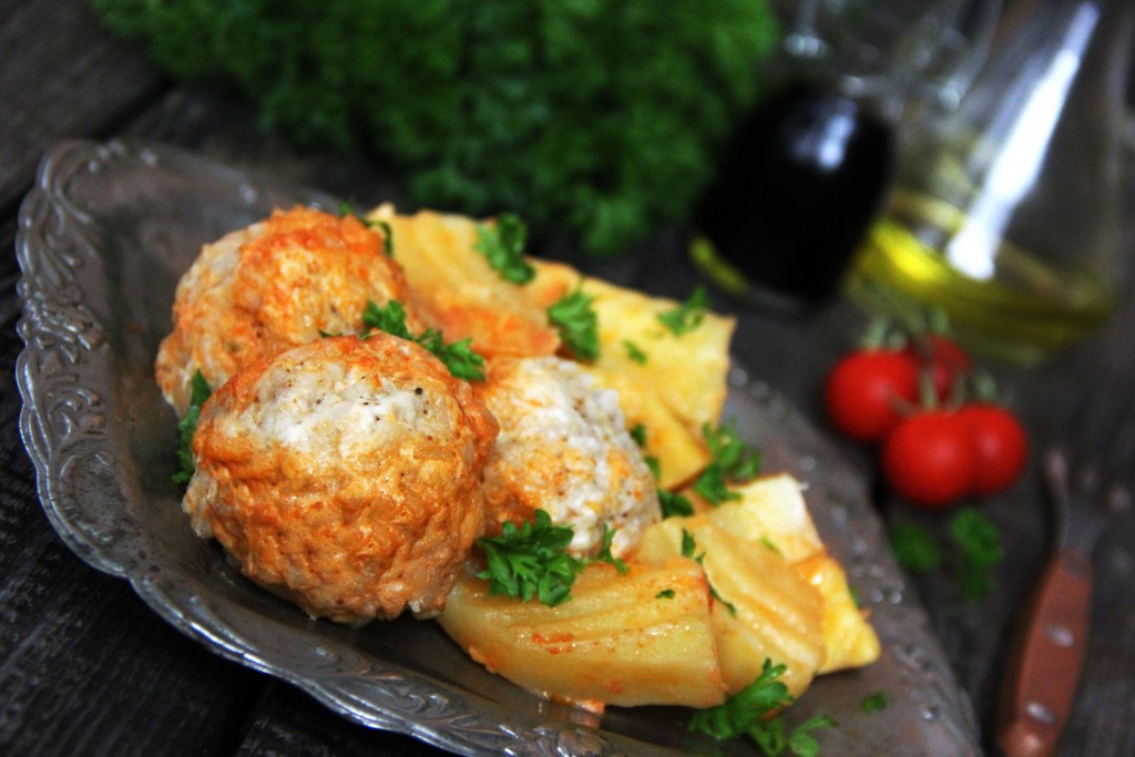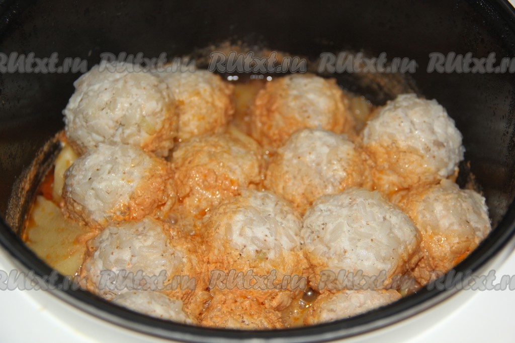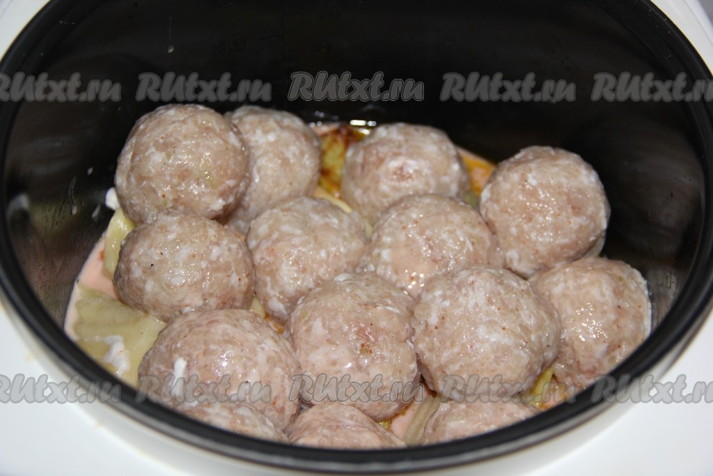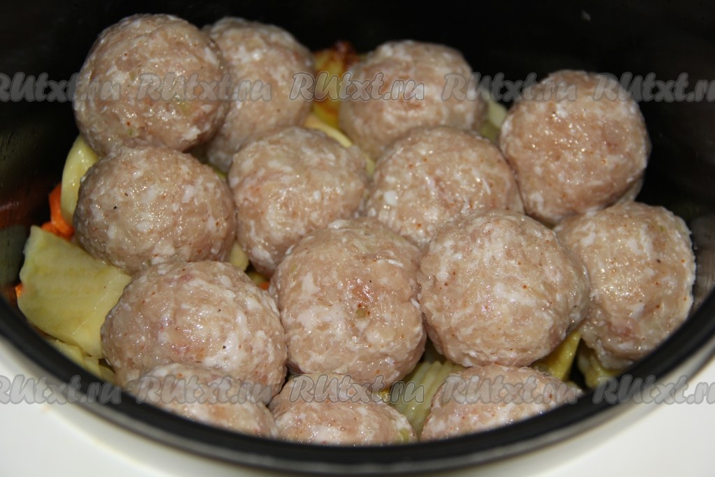Затем выложить тефтели поверх картошки с морковкой.