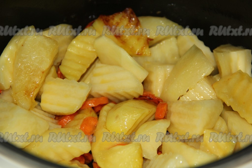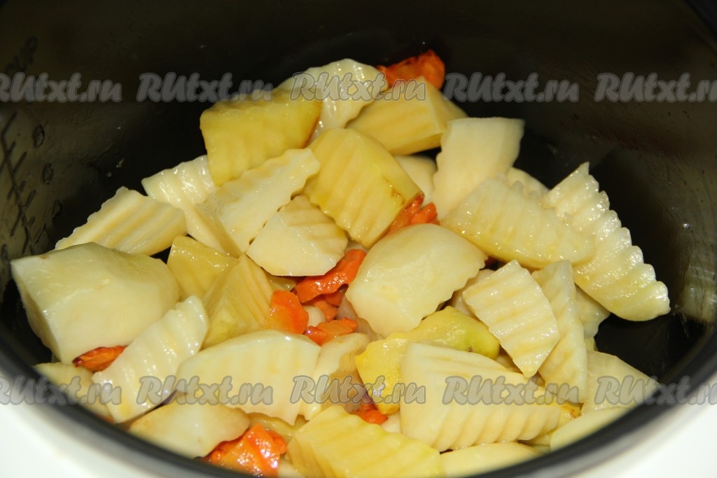 Картофель почистить, нарезать крупными дольками, выложить в чашу мультиварки и перемешать с морковью. Включить режим "Жарка".