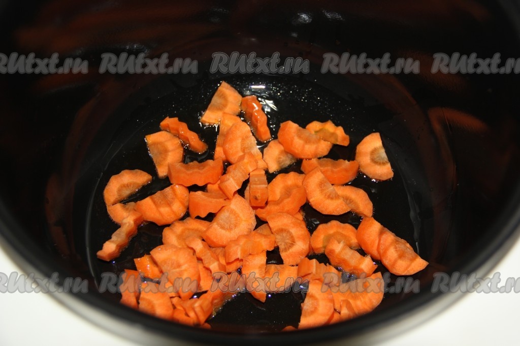 В чашу мультиварки влить растительное масло, выложить очищенную и нарезанную морковь (я нарезала полукольцами).