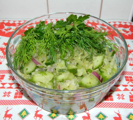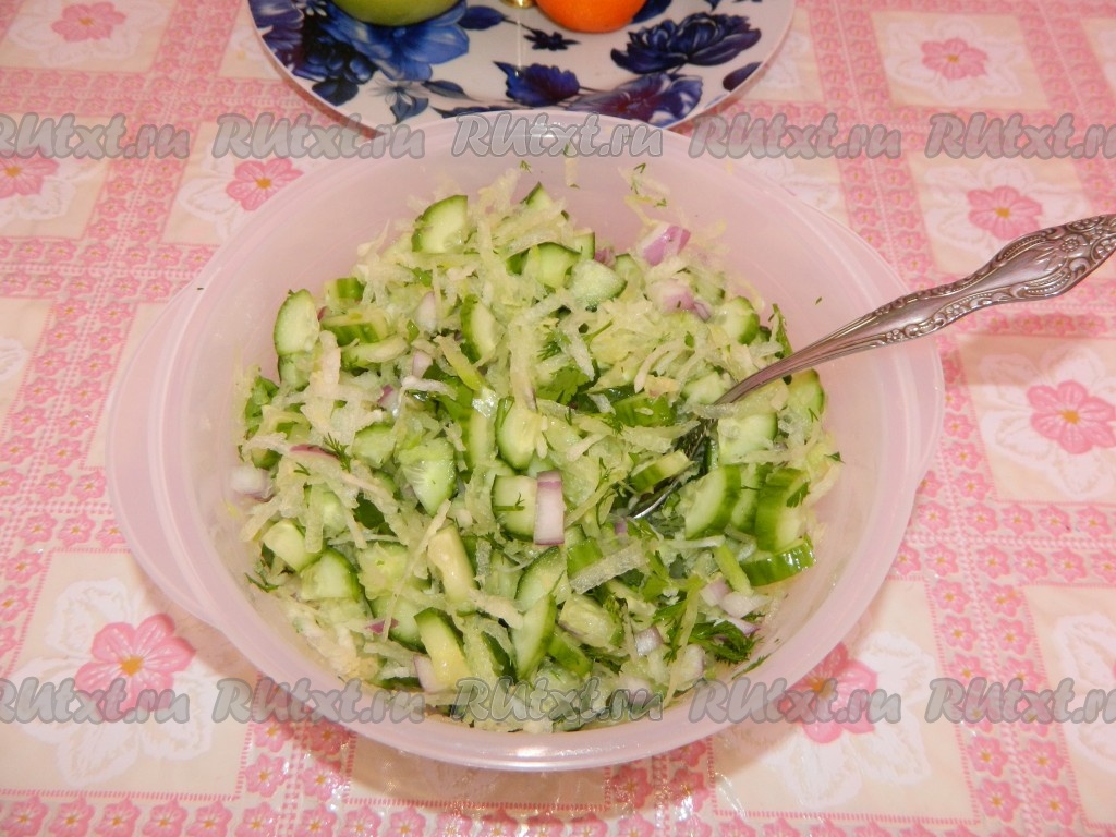 Перед подачей добавляем в салат заправку. Можно украсить веточками зелени. Этот салат из зелёной редьки и огурца готовится просто, из доступных продуктов, а получается вкусным и полезным.