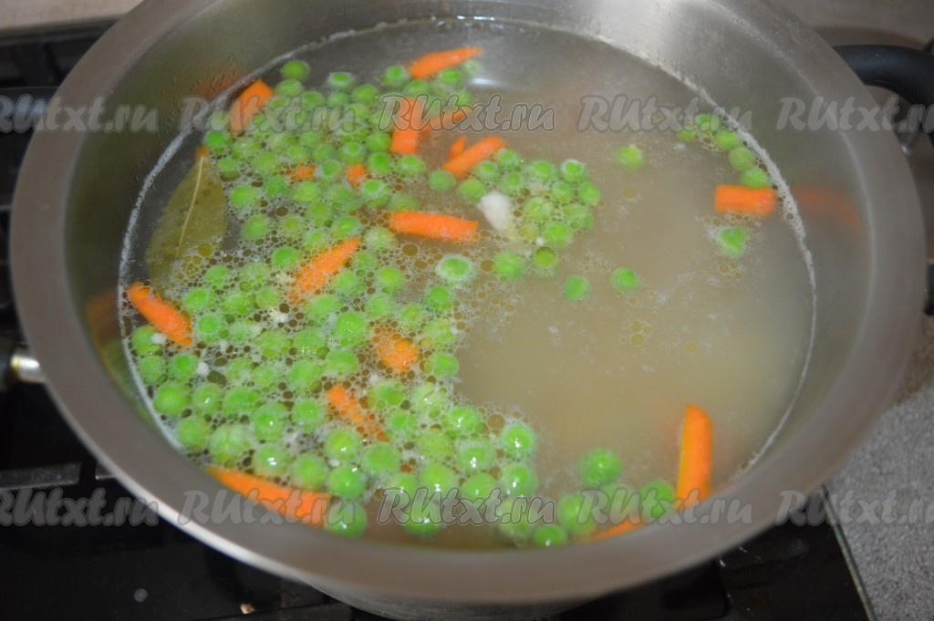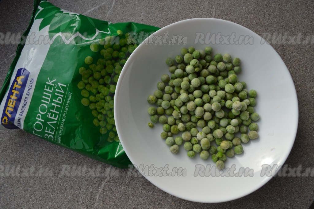Следующим добавить замороженный зелёный горошек (размораживать его не нужно).
