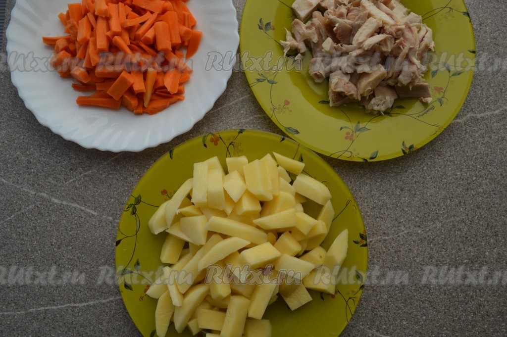 Когда сварится куриное мясо, кастрюлю снять с огня, бульон процедить. Луковица нам больше не понадобится. Достать мясо из бульона и дать немного остыть. Как только мясо остынет, отделить его от костей, а затем нарезать (или разобрать на волокна). Очистить морковку и картофель. Нарезать морковку на средние брусочки, чуть крупнее нарезать картофель. Картошку поместить в ёмкость с водой, чтобы картошечка не почернела.