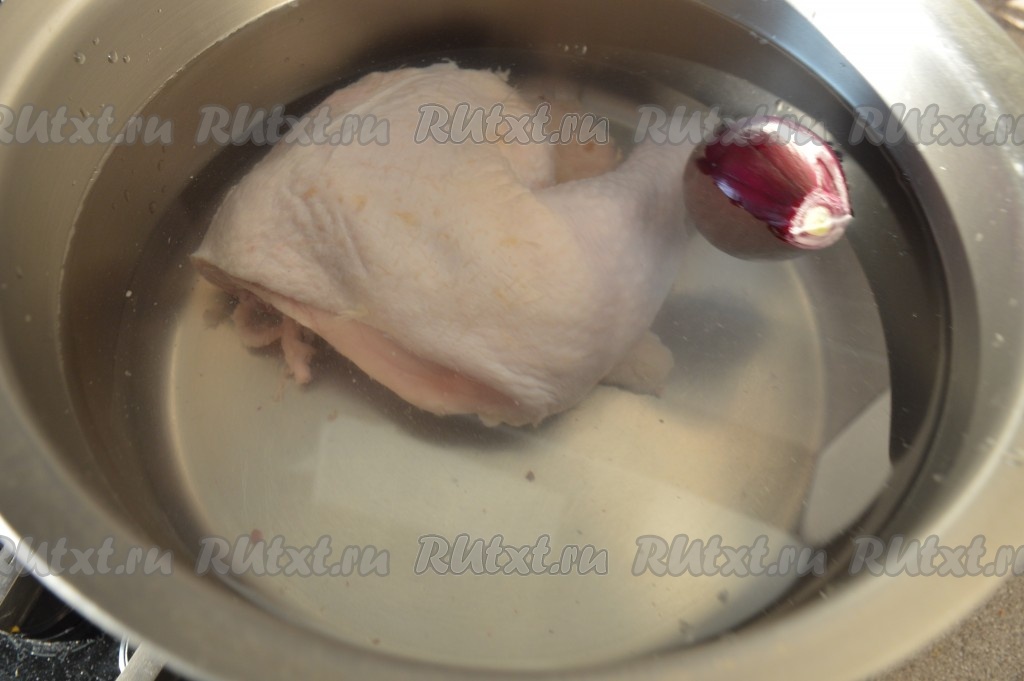В кастрюлю налить, примерно, 2 литра чистой воды, опустить туда одну очищенную луковицу и кусочек курицы (я взяла окорочок). На сильном огне довести до кипения, снизить огонь до слабого, снять образовавшуюся пенку и варить бульон примерно 30 минут (до готовности куриного мяса).