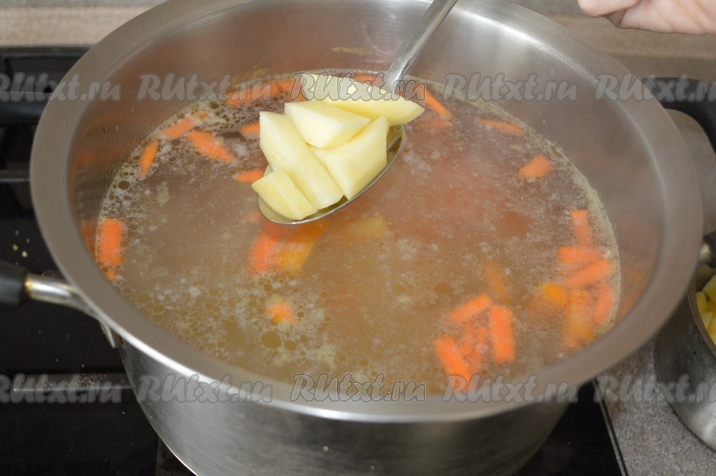 Затем в суп добавить нарезанную картошку, варить минут 10-15.